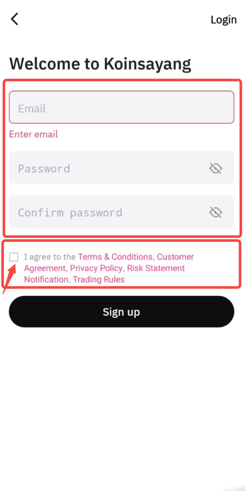 Before proceeding, we strongly recommend that you read and understand our Terms & Conditions, Customer Agreement, Privacy Policy, Risk Disclosure Statement, and Trading Rules. Once you agree, tick the consent checkbox and tap [Sign Up] to continue.