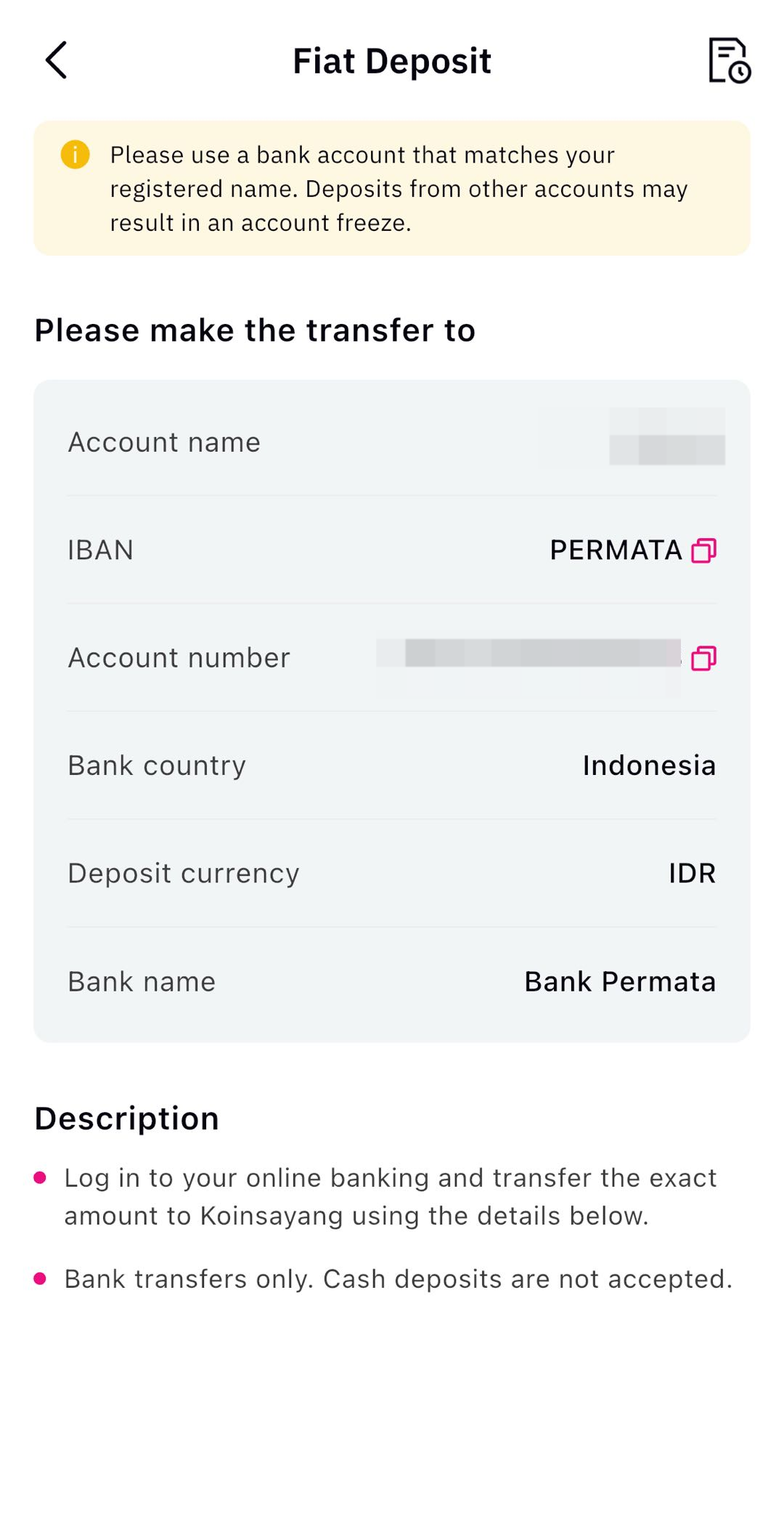 Step 5: Copy the bank account number provided, then use your banking app to transfer IDR into your Koinsayang account.