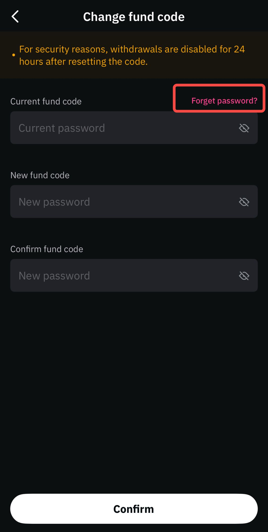 Step 4: Enter your current Fund Password, then create a new one in the designated field. Re-enter the new Fund Password in the “Confirm Fund Password” field to ensure accuracy. Tap [Confirm] to proceed.