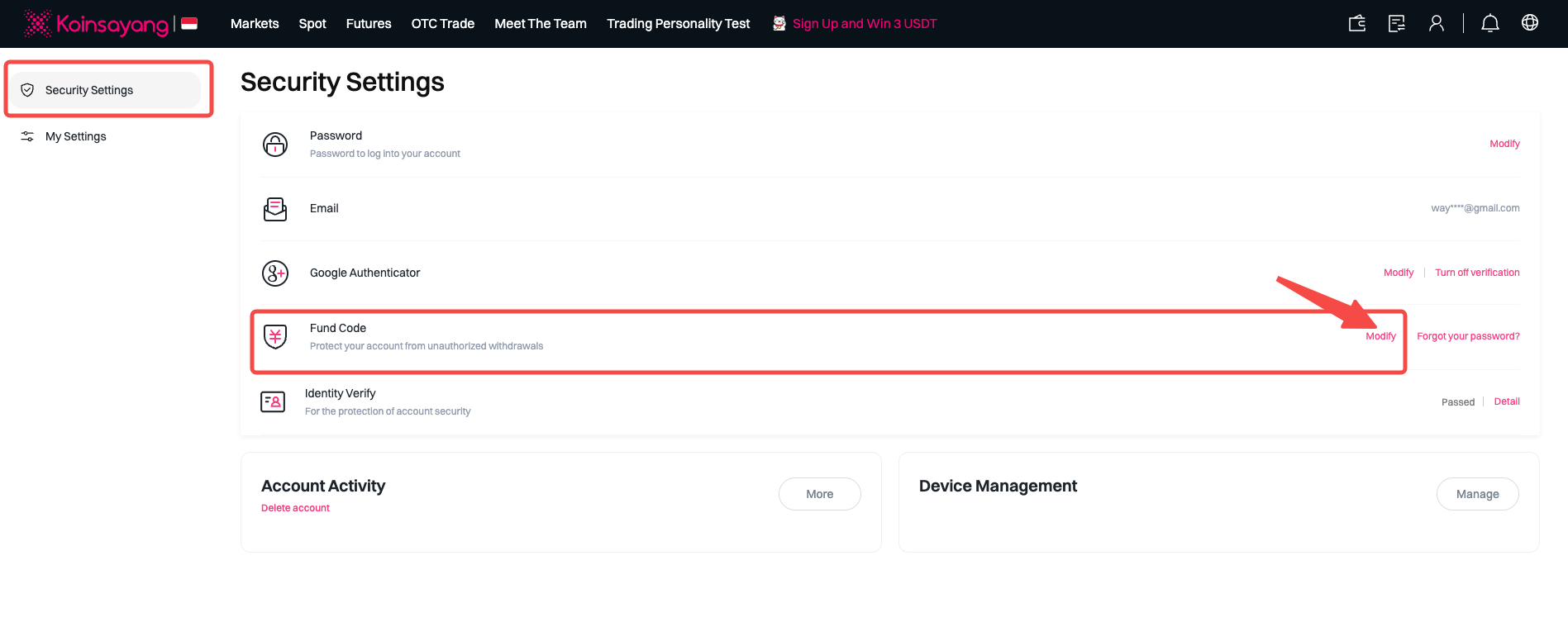 After logging in, you can directly go to the Fund Password Settings page using this link: https://www.koinsayang.com/id/account/setting/fundpassword. Then, click on [Security Settings] > then click [Modify].