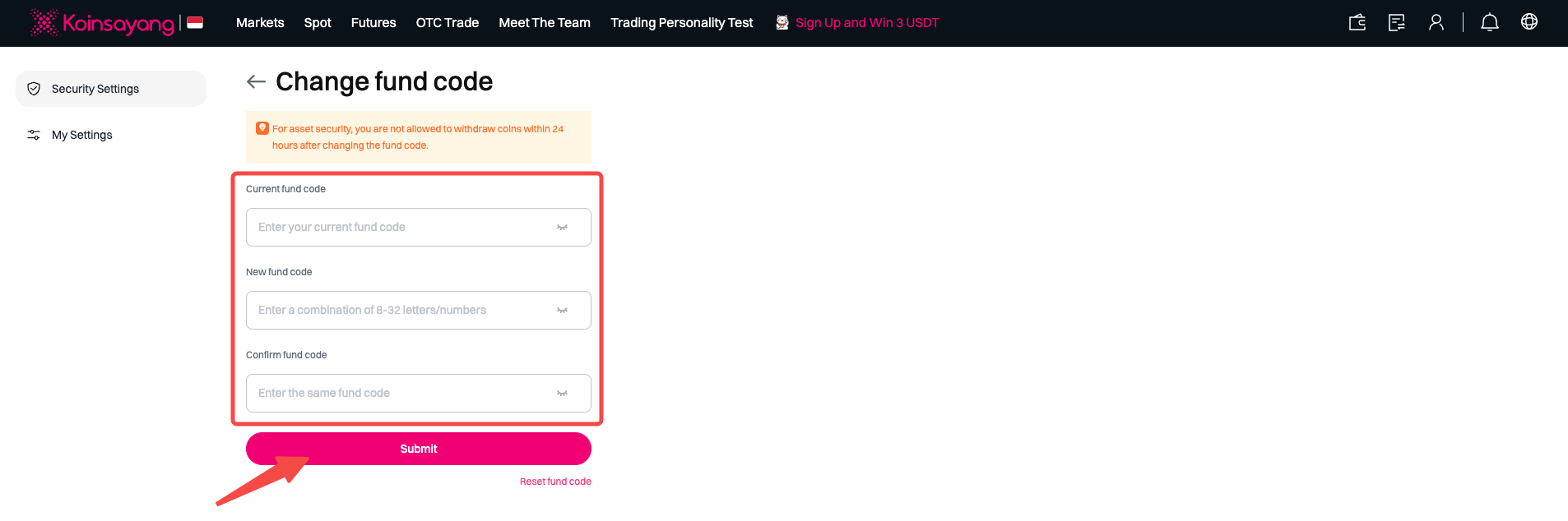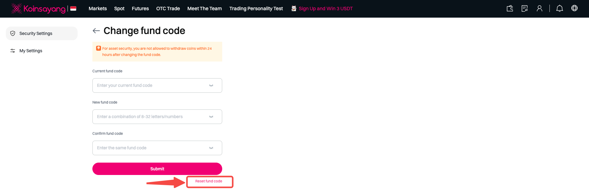 Step 4: If you forgot your original fund password, you can click [Reset Fund Code] to reset it.