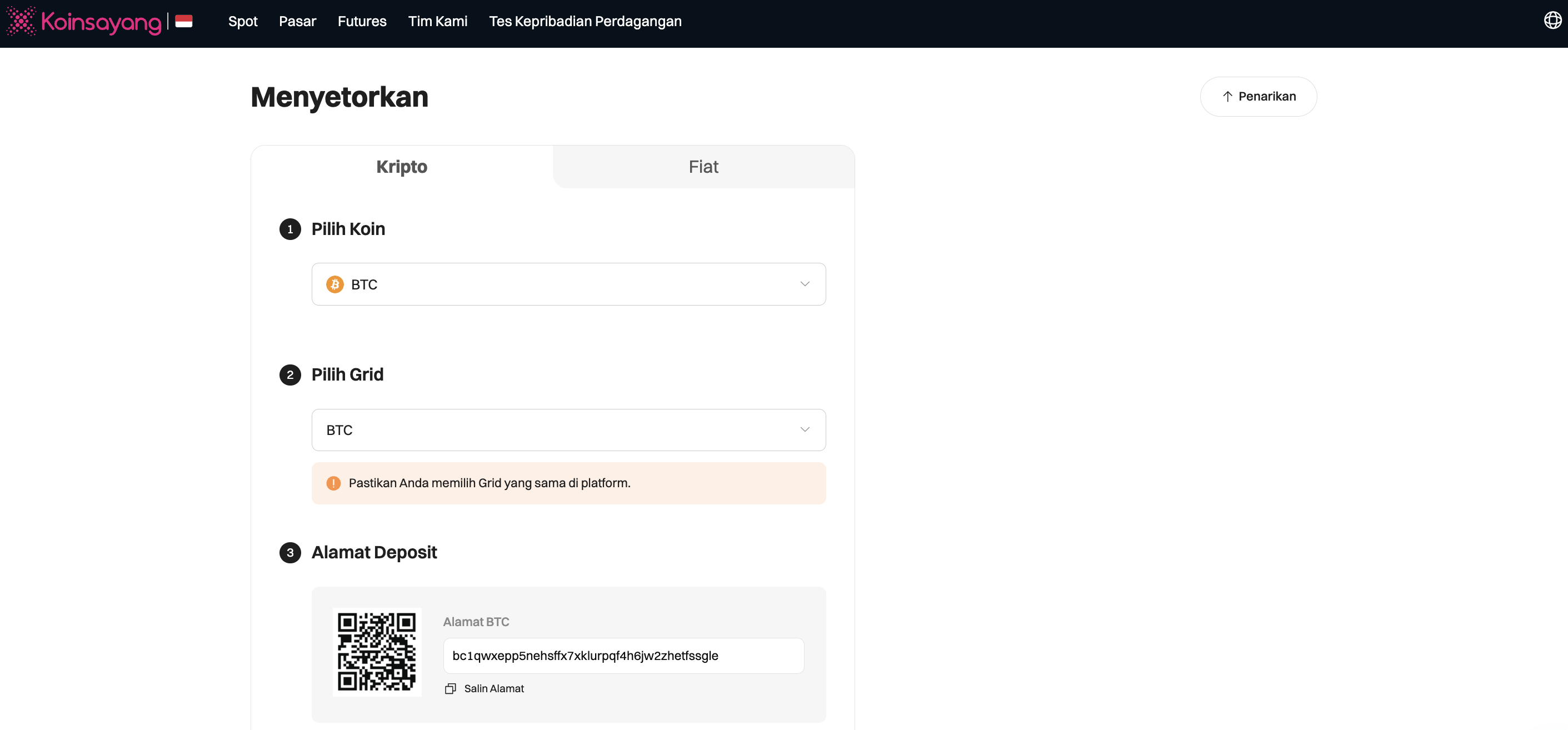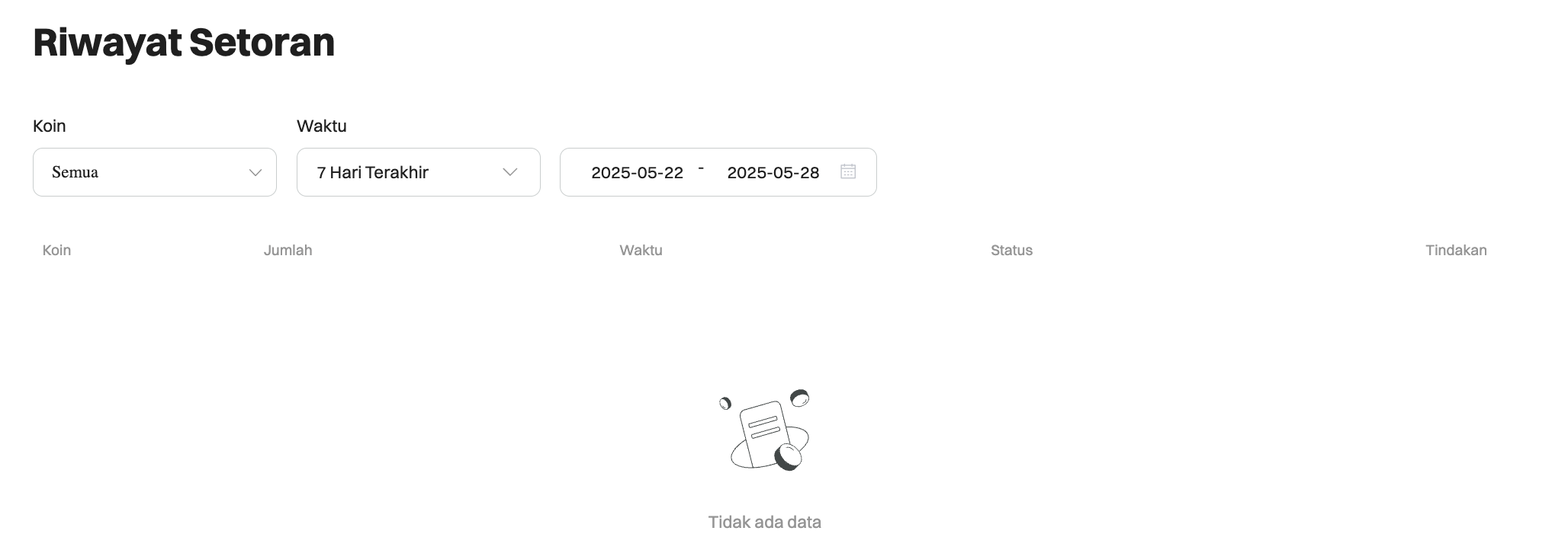Bagaimana cara memeriksa status atau riwayat deposit saya di Koinsayang? 28 Mei, 2025 09:40 Diperbarui Masuk ke akun Koinsayang anda Akses halaman deposit di: https://www.koinsayang.com/id/asset/recharge Pilih tab "Crypto" untuk melihat riwayat deposit kripto, atau "Fiat" untuk deposit fiat. Scroll ke bawah untuk melihat daftar riwayat deposit anda. Artikel terkait Cara Melakukan Penarikan Kripto di Koinsayang Cara Melakukan Setoran Kripto ke Akun Koinsayang Anda