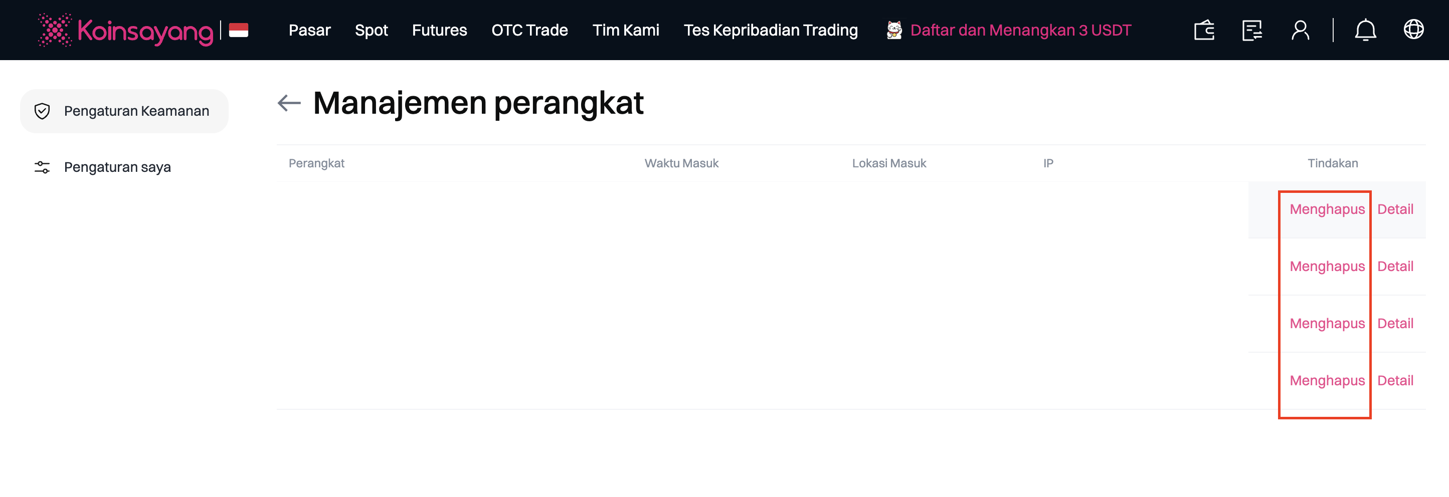 Anda dapat melihat aktivitas perangkat yang mencurigakan pada akun Anda dengan masuk melalui situs web di tautan berikut: https://www.koinsayang.com/id/account/setting/devices. Anda dapat mengklik [Menghapus] jika perangkat tersebut tidak Anda kenali.