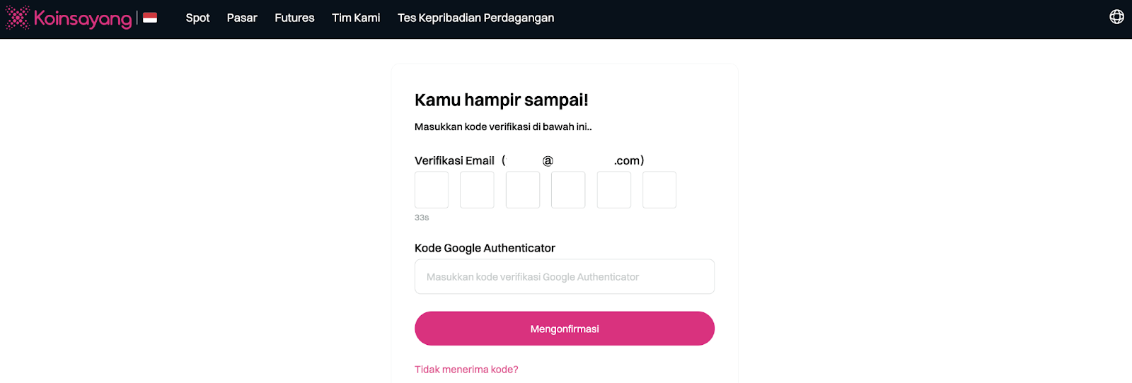 Mohon buka aplikasi Google Authenticator anda, temukan kode unik yang dihasilkan untuk akun Koinsayang anda, dan masukkan kode tersebut ke kolom yang tersedia. Terakhir, klik tombol "Mengonfirmasi" untuk menyelesaikan proses masuk anda.